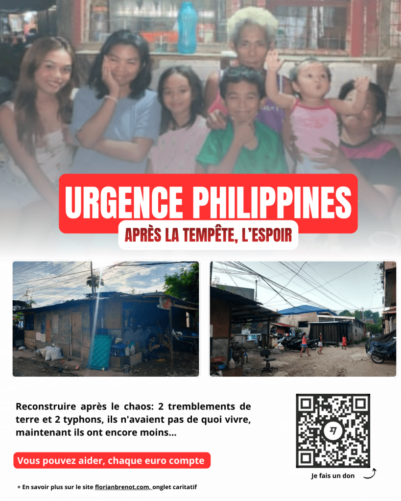 - je soutiens une famille philippine que j’ai rencontré lors d’un voyage depuis mai 2025. Ça peut sembler fou, mais je ne conçois pas de les laisser mourir de faim (littéralement, malheureusement…). Mais comme je ne peux pas subvenir à tous leurs besoins, je mets aujourd’hui en place un système qui permet à chacun-e d’aider cette famille selon ses envies et capacités.